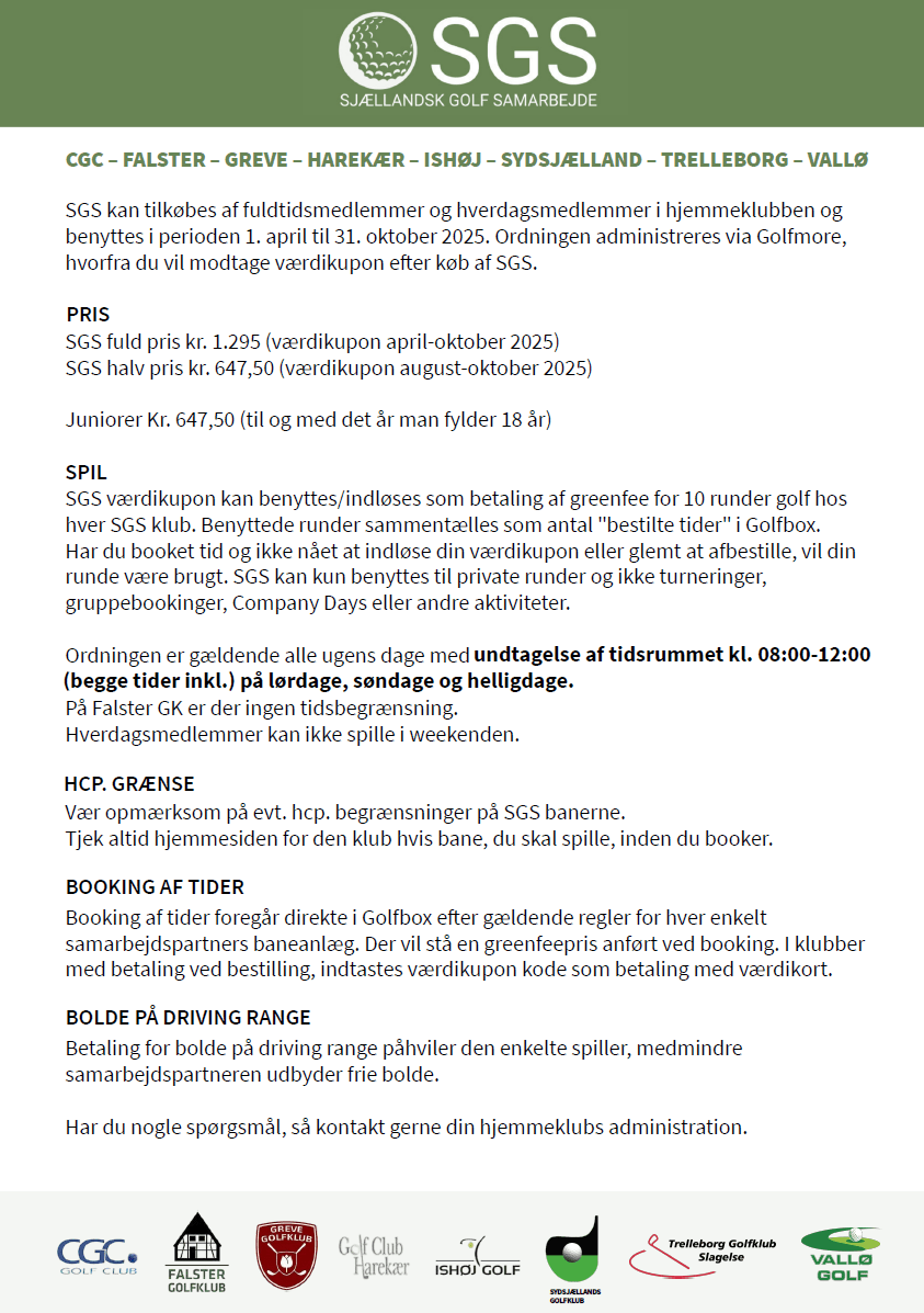Klubben Bestyrelse Udvalg Baneudvalg Begynderudvalg Ungdomsudvalg Regel- og handicapudvalg Sponsorudvalg Sportsudvalg Turneringsudvalg Informationsudvalg Ordensregler Sponsorer Klub i klub Gentlemens Club Fiftyklubben Vikingerne Medlemskaber SGS Turneringer Klubturneringer Klubmesterskab Regionsgolf Øst Danmarksturnering Nybegyndere Ungdom Talentarbejde Vedtægter